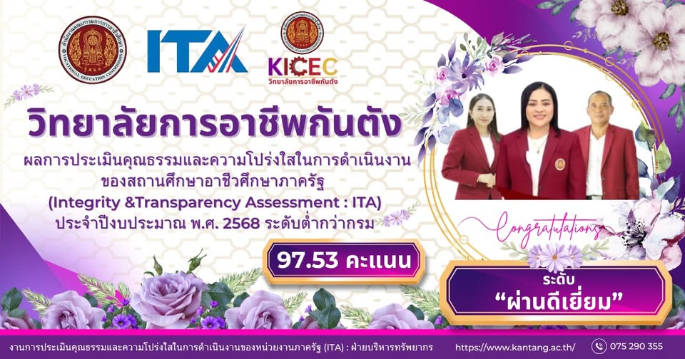 ผลการประเมินคุณธรรมและความโปร่งใสในการดำเนินงานของสถานศึกษาอาชีวศึกษาภาครัฐ(Integrity and Transparency Assessment : ITA)ประจำปีงบประมาณ 2568 จดหมายข่าว ประชาสัมพันธ์ 12 พฤศจิกายน 202512 พฤศจิกายน 2025kantang2025 ผลคะแนน “97.53” อยู่ในระดับ “ผ่านดีเยี่ยม”